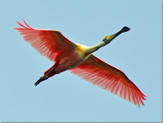 The "Roseate Spoonbill" has a spatula bill plus pale pink plumage
